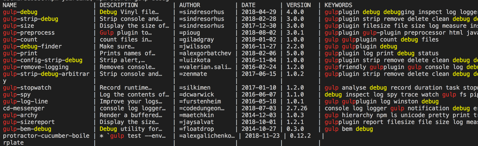 npm s gulp debugПосле выполнения этих команд в терминале будет напечатан список пакетовс оприсанием, указанием авторов и другой информацией.